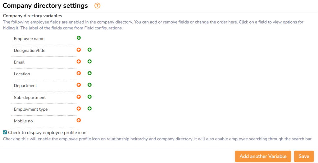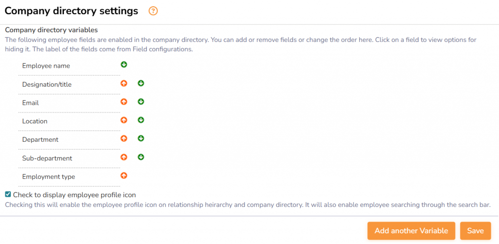 ● Setup the variables and the order, and it will display in the company directory for all employees. Active variables from Employee basic info, Employment details, and Employee other details are automatically displayed here and can be configured by using Configure HRIS fields.