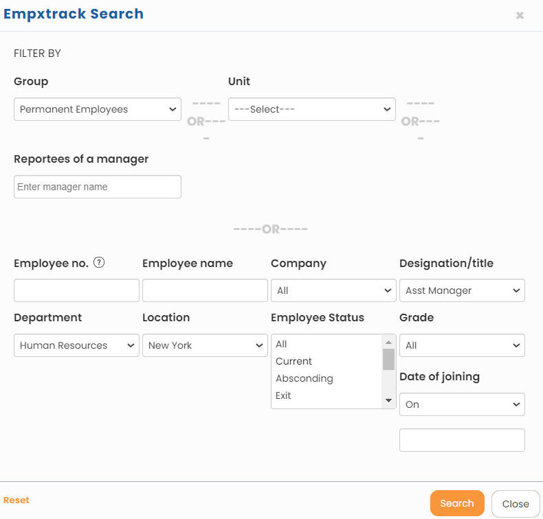 a. Select Permanent from the Group dropdown. Then select Assistant Manager, Human Resources, New York from Designation, Department and Location dropdown respectively.