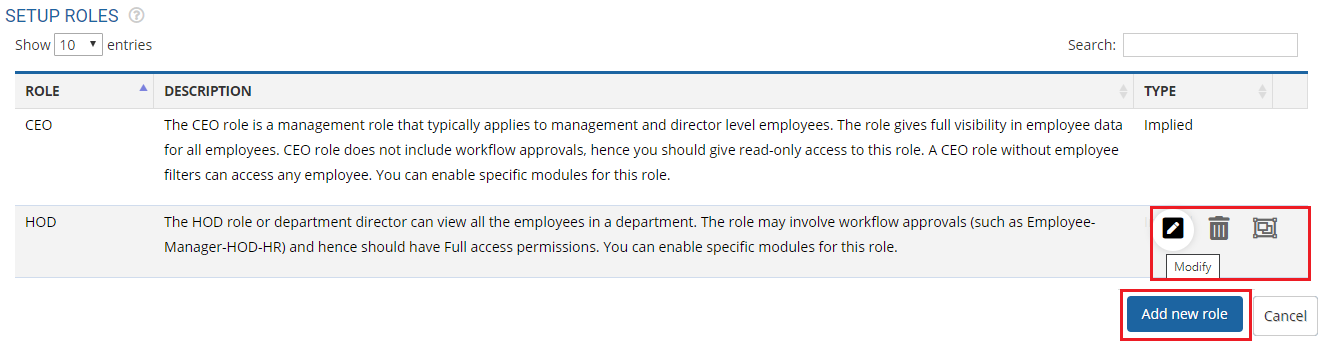 - Click Add new role to setup a new role in the system.