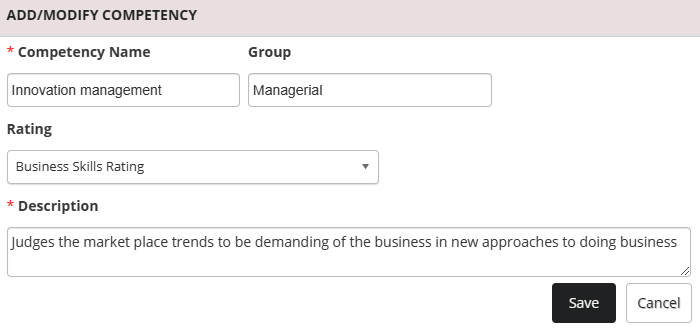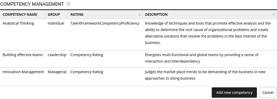 Each competency is associated with a group. All competencies in the same group are clubbed together in the performance appraisal. Competencies are also associated with ratings and can contain a description.