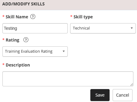 - Provide a brief in the Description textbox and click the Save button. The new skill is successfully added to the existing list.