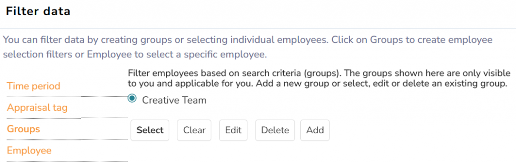● From the Role and Features menu, click on Appraisals. Filter the appraisal records by selecting the relevant Time period, Appraisal tag and Groups. To learn how to filter appraisal records, click Filter data and follow the steps.