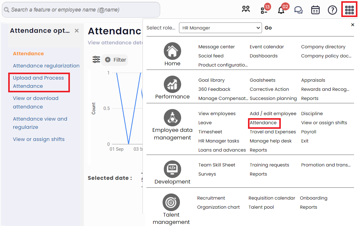 - On the Dashboards homepage, go to Role and features menu and click Attendance. Under Attendance options, click on the Upload and Process Attendance.