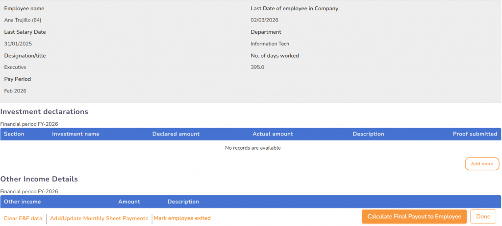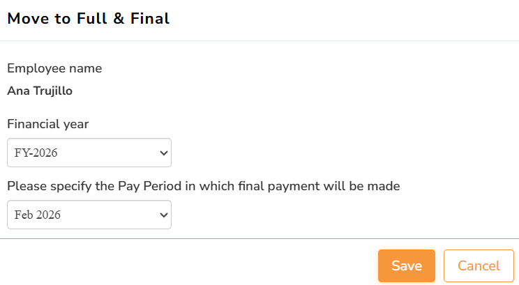 ● The Move to Full & Final page appears, where you can view the employee’s name. Mention the financial year and specify the pay period for the final payment.