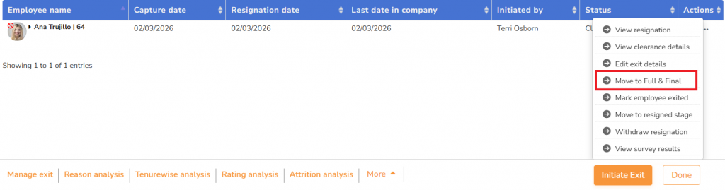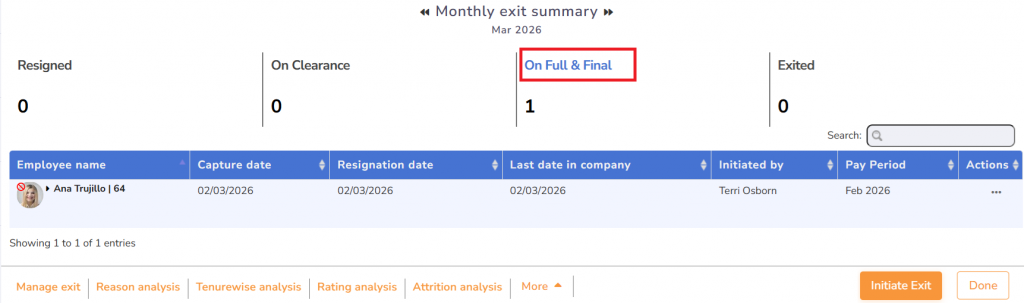 ● Under Monthly Exit Summary, click on the Move to Full & Final option.