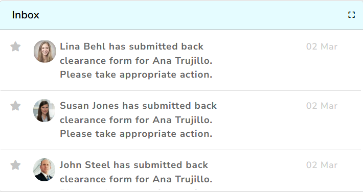 ● All employees (to whom the clearance request is sent) get a notification in the message box. They can click the View icon in the message and approve the clearance request if all dues are clear.