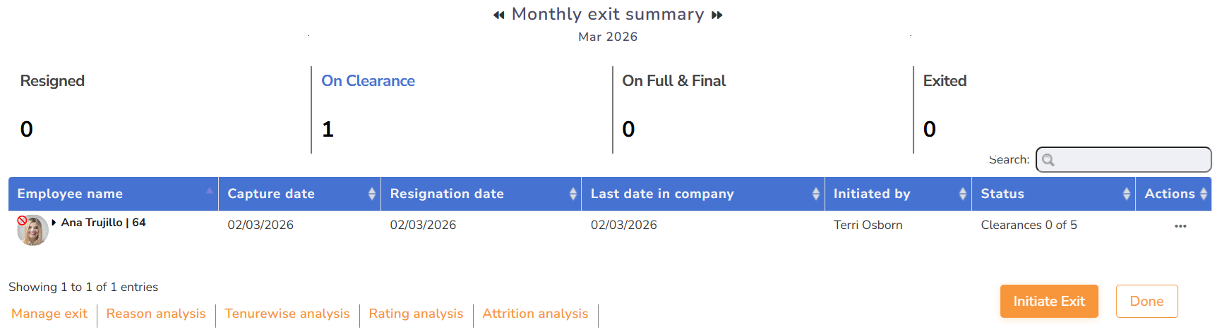Under the Monthly Exit Summary, the table gives details on the exiting employee along with their last working date, the exit request initiated by, and the status of the request.