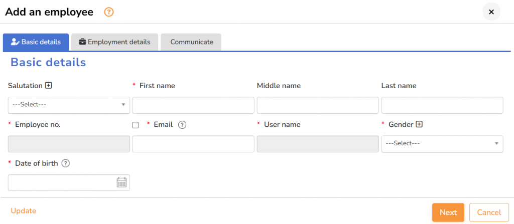 ● Click the Add an Employee link. The Add new employee form appears where you need to fill Basic details, Employment details and details under the Communicate tab.