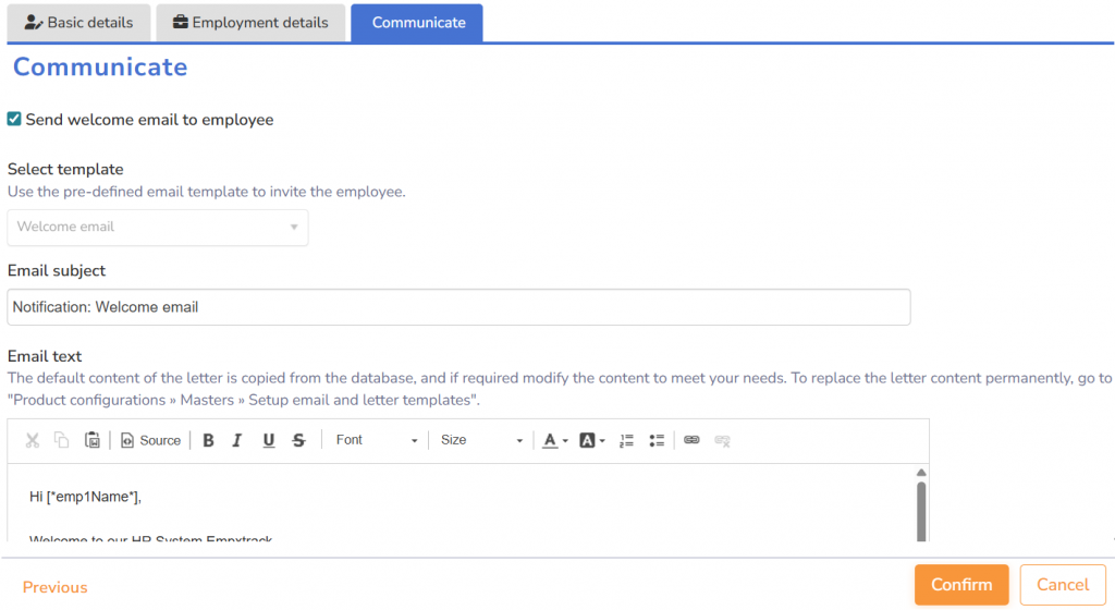 ● Under the Communicate tab, you can send a welcome email to the new employee.