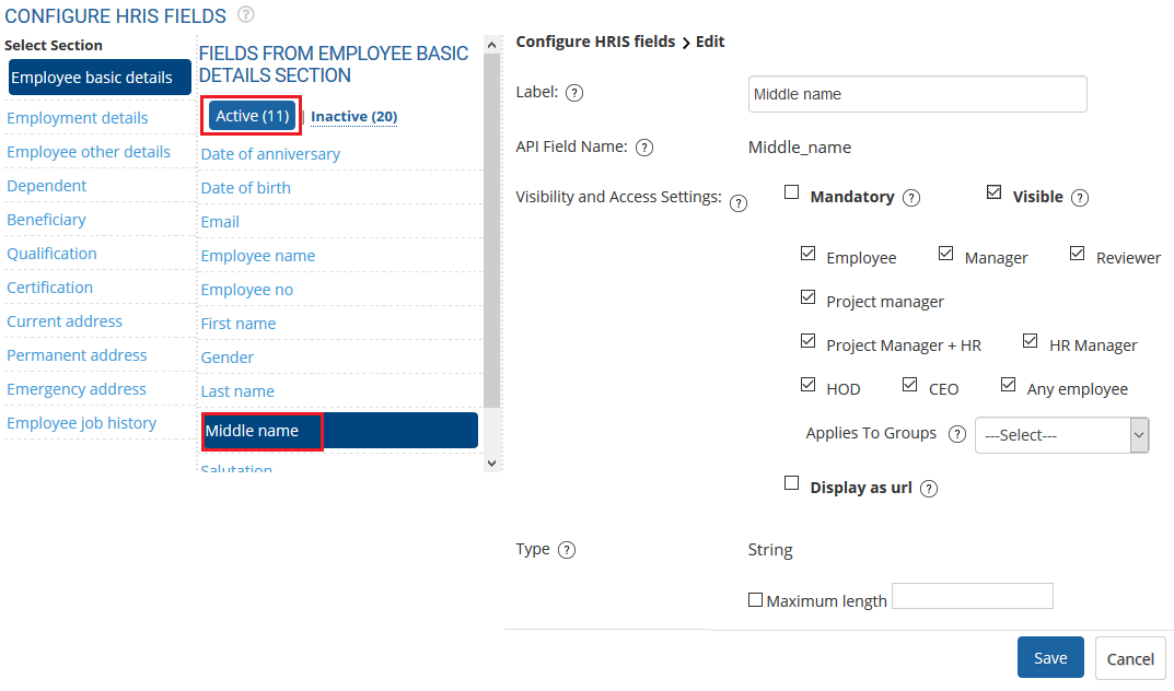 Click on the Inactive fields to add a new fields to the section. The activated fields automatically show up in reports, employee profile and upload/download formats and API with the labels that have been setup here.