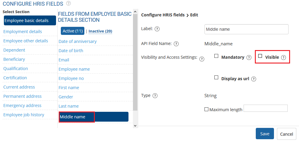 - Deactivate the active variables that are not required. Click Active button and go to the field that you want to make Inactive. For instance, we want to make Middle name as an Inactive field.