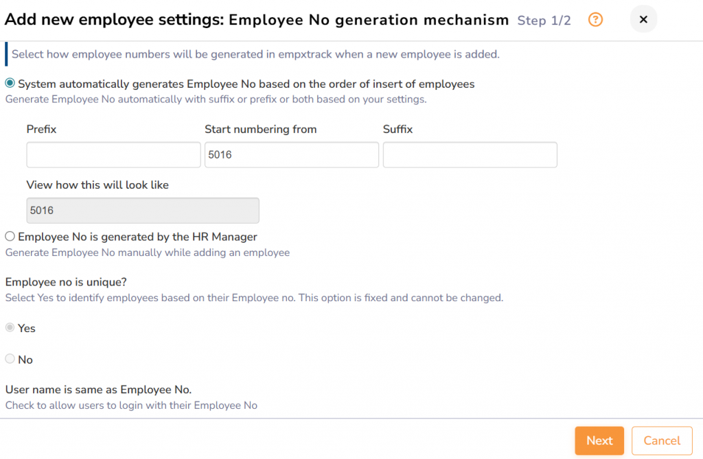 Each employee is assigned a unique identification number in the organization. Empxtrack offers a functionality to setup rules for generating a unique employee number.