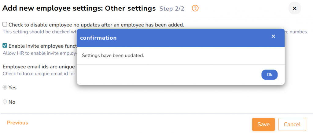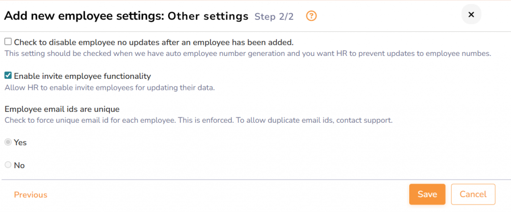 ● By default, Yes is selected in Employee Emails are unique field and the field is uneditable to allow a unique email id to be added to the system.