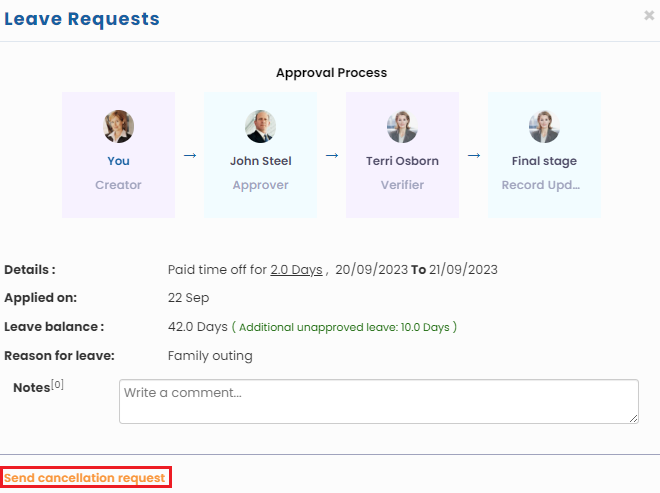 Note: Leave cancellation request depends upon the workflow. While defining a workflow in the application, setup a rule to allow employees to cancel leave even if it is approved by the Manager.