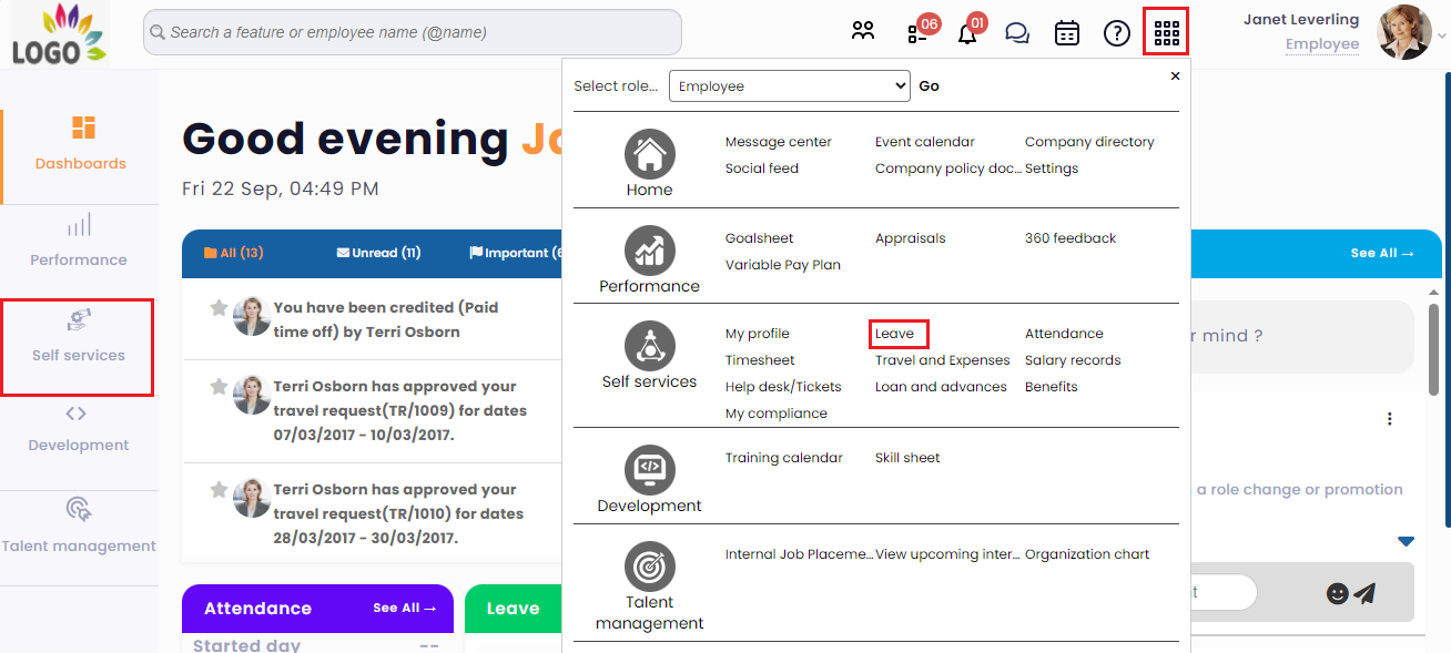 2. On the Dashboards homepage, click Role and features menu and click LeaveMy leave page appears on the screen.