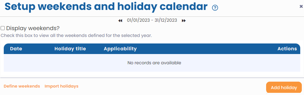 Each company has week off day(s) and set of holidays applicable for a year. Setup Weekends and Holiday Calendar functionality allows setting up of weekly off and holiday calendar as per your company policy.