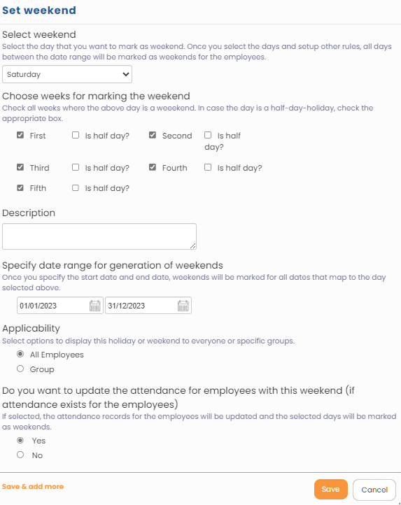 Keep All employees option selected from Applicability field if you want to make this weekend applicable to all the employees of the company. Else if you want to allow this weekend to be applicable to selected employees then select Group option and then select the desired group.Note: For Group option to be selected, the group must already be created by the HR Manager. Learn how to Setup Global Groups.
