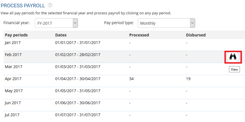Hover the mouse in a tabular line of any pay period, View icon appears that allows you to view details of the respective pay period.