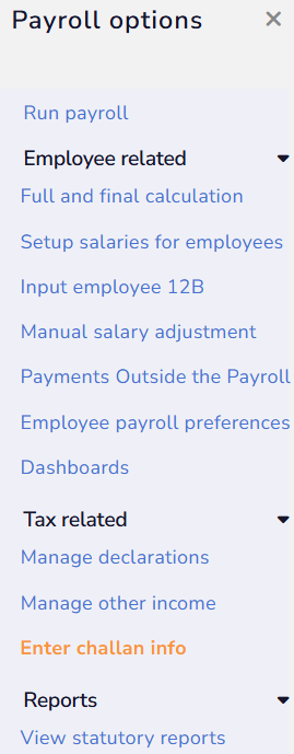 ● From the Roles and features menu, click on the Payroll link. Under Payroll Shortcuts, click on the Enter Challan Info tab.