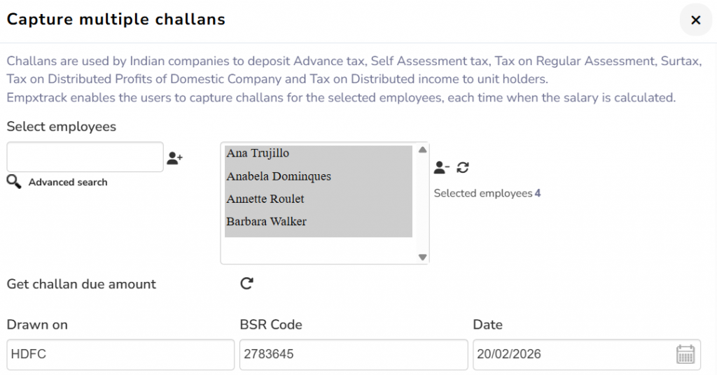 - Select employees. You can remove some or keep all employees for whom you want to capture challans. If you remember the names of employees, you can type their names in Enter Name field and click (+) sign to select them.