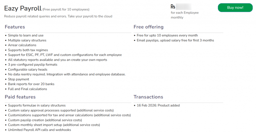 Note: Click on the product name (Eazy payroll), to view features, free offering details and paid features.