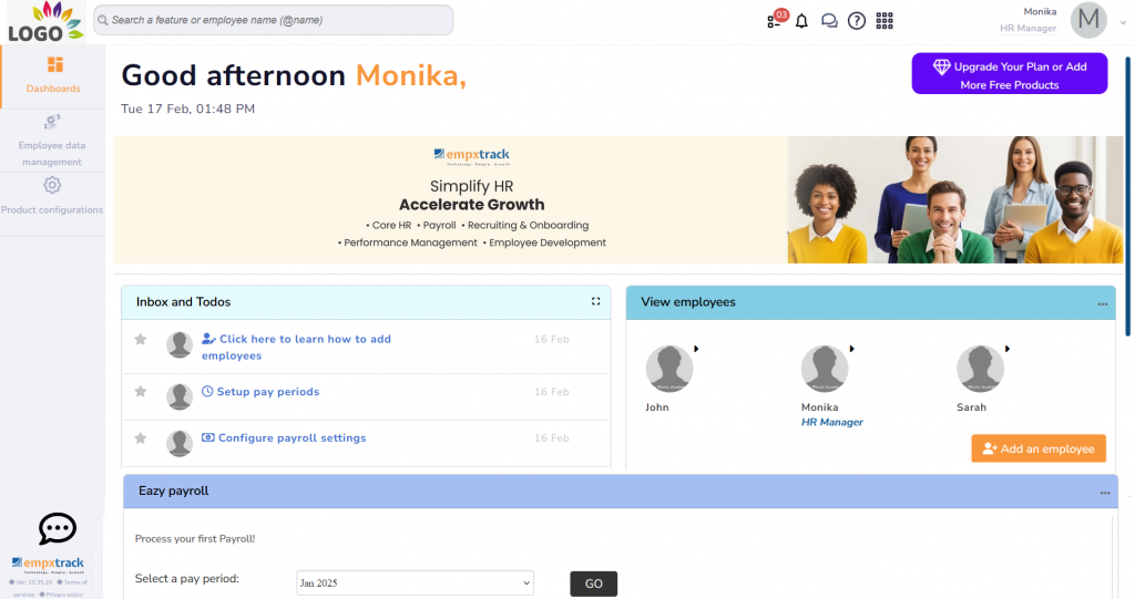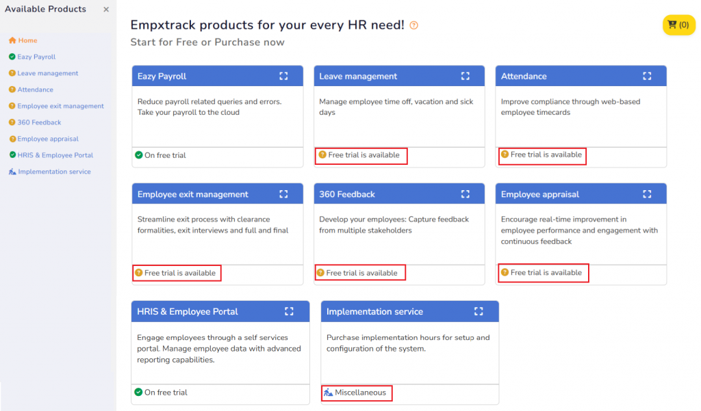 Empxtrack Eazy Payroll is a free offering that allows payroll processing for free for up to 10 employees every month. Upgrade Empxtrack Eazy Payroll to increase employee licences, get implementation service and more. Get the option to add more products for free, including Leave management, Attendance, Employee appraisal, 360 Feedback, Employee exit management, and more.
