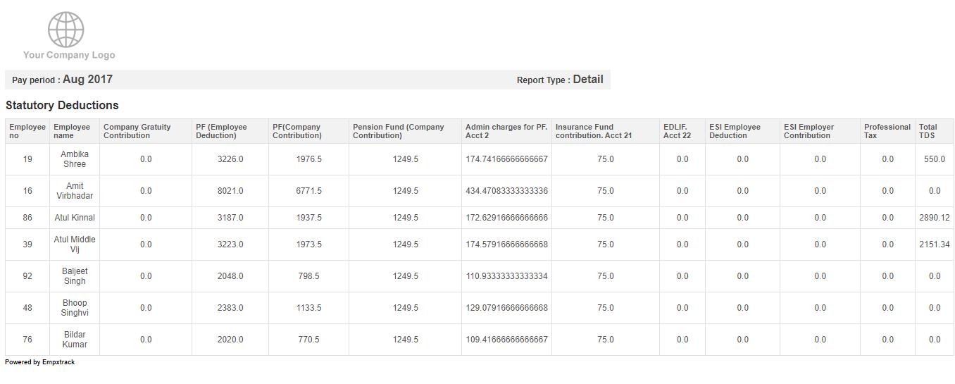 Statutory deduction report: Get a brief on all the statutory deductions like Provident Fund, ESI, TDS, Gratuity and Professional Taxes (PT), employee wise.