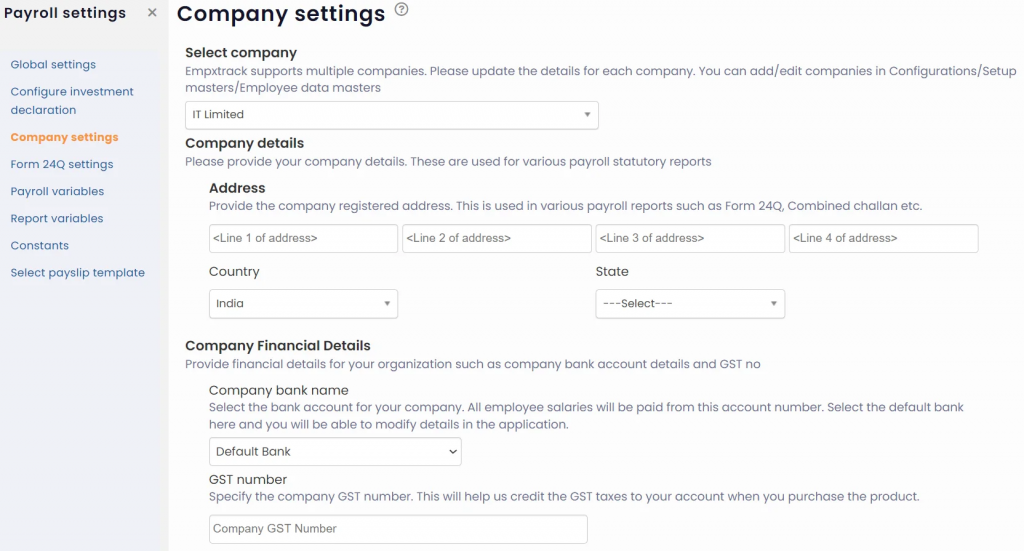● Provide the company financial details to meet compliance. Specify bank account details and GST number. This helps in crediting the GST taxes to the user account when the Empxtrack product is purchased.