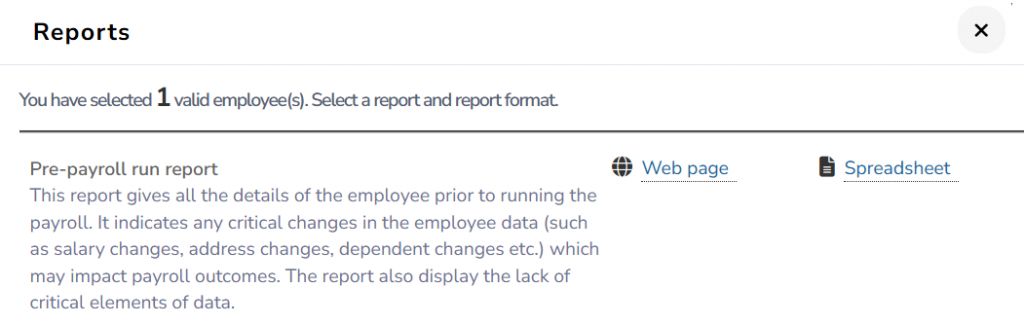 ● Click Reports button to view pre-payroll run report which is generated in two formats – web browser and spreadsheet.