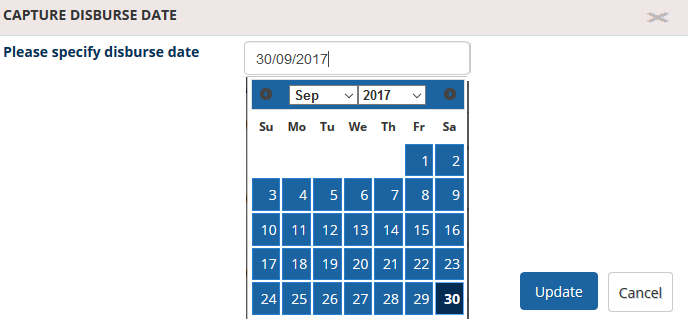 - Specify the disburse date using the integrated calendar option as shown in Figure 1. This step schedules the salary disbursal date for the selected employees on a specific date. Now click Update button.