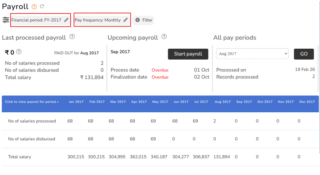 ● Click on the Payroll link from the Roles and features menu. The page displays the selected financial year in Financial Year dropdown, and the selected pay period type in the Pay frequency field. All the pay periods of the selected financial year appear in the list. It displays number of processed and disbursed payrolls in the Processed and Disbursed columns.