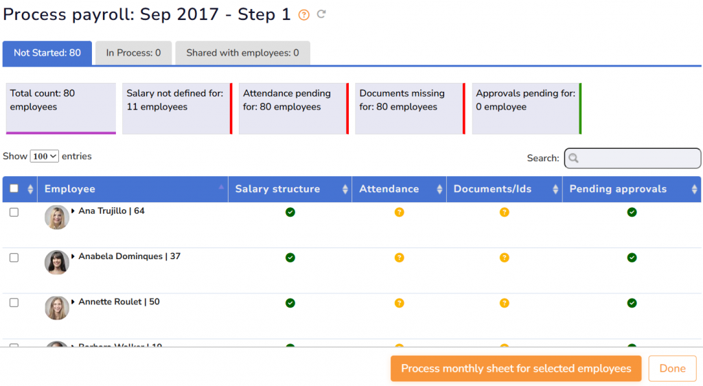 ● In the Not started tab, you will see that the payroll process has not started, and some parameters are given that require information to start payroll preparation. During payroll preparation, check out the values of various parameters such as Date of Joining, Attendance, Salary structure, State (for professional tax), PAN No (for TDS, Form 24Q), UAN (for PF), Bank Account (salary transfers) and Pending approvals (correct calculations).