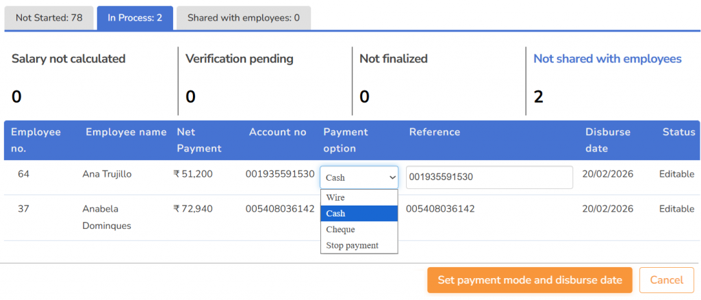● The option to edit the payment mode appears. You can choose any of the given options (Cash, Cheque, Wire and Stop Payment) in the Payment option dropdown for the respective employees.