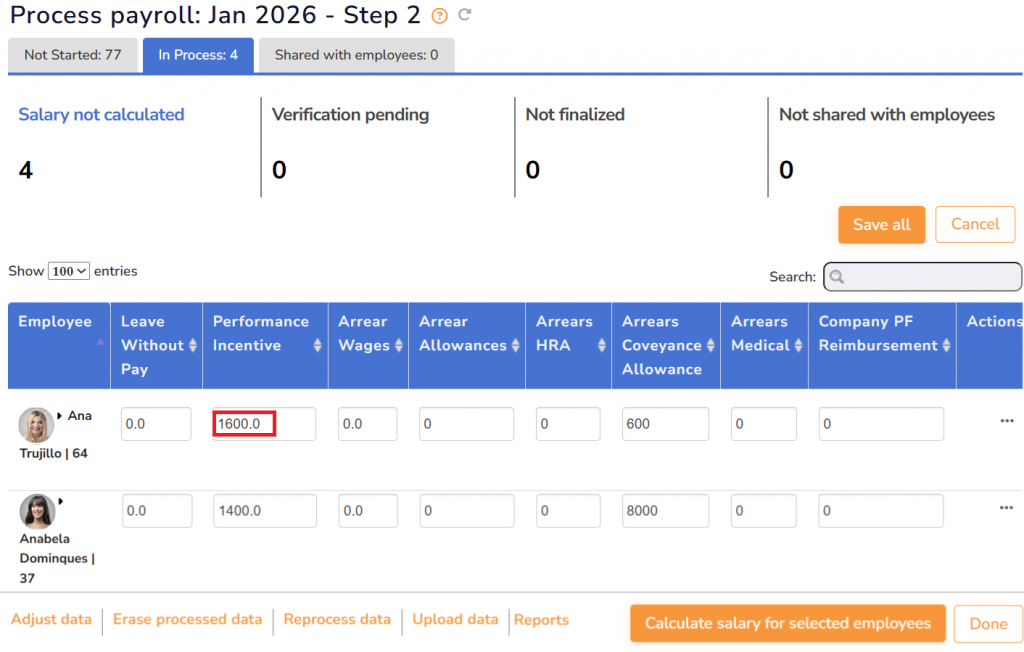 ● Alternatively, you can select the employees whose payroll you want to adjust and click the Adjust data button. The payroll details for the selected employees appear on the page. Modify the values manually and click Save all.