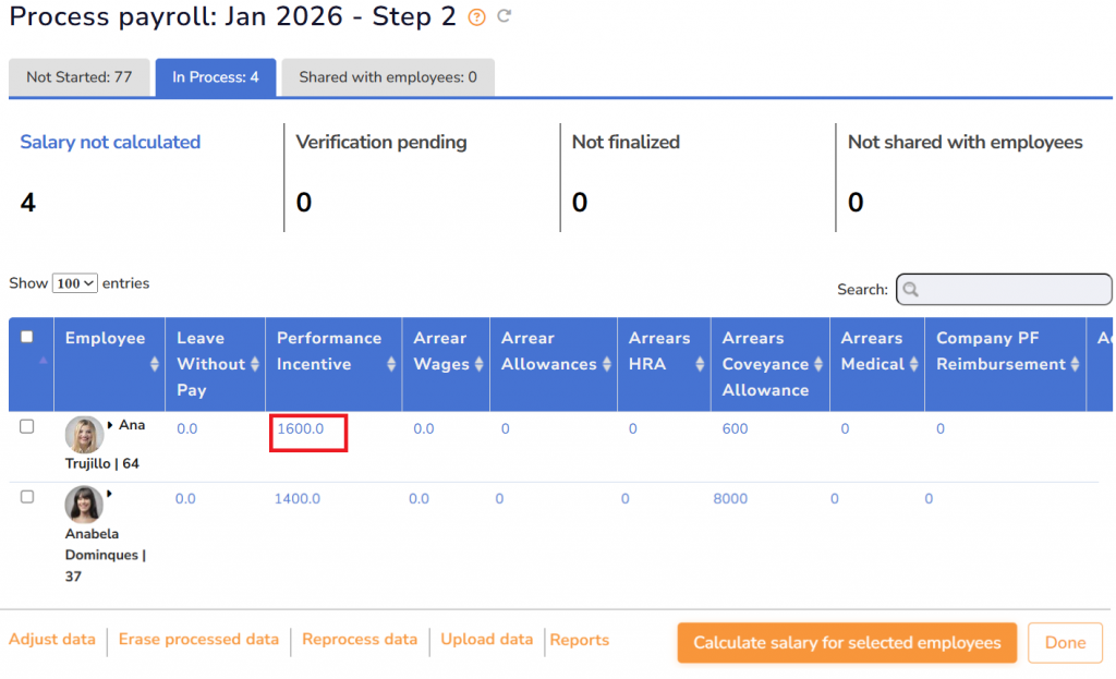 ● The Process Payroll: Step 2 page displays four sections under In Process tab, i.e. Salary not calculated, Verification pending, Not finalized and Not shared with employees. The page also shows the list of selected employees whose payroll is calculated for the selected pay period.
