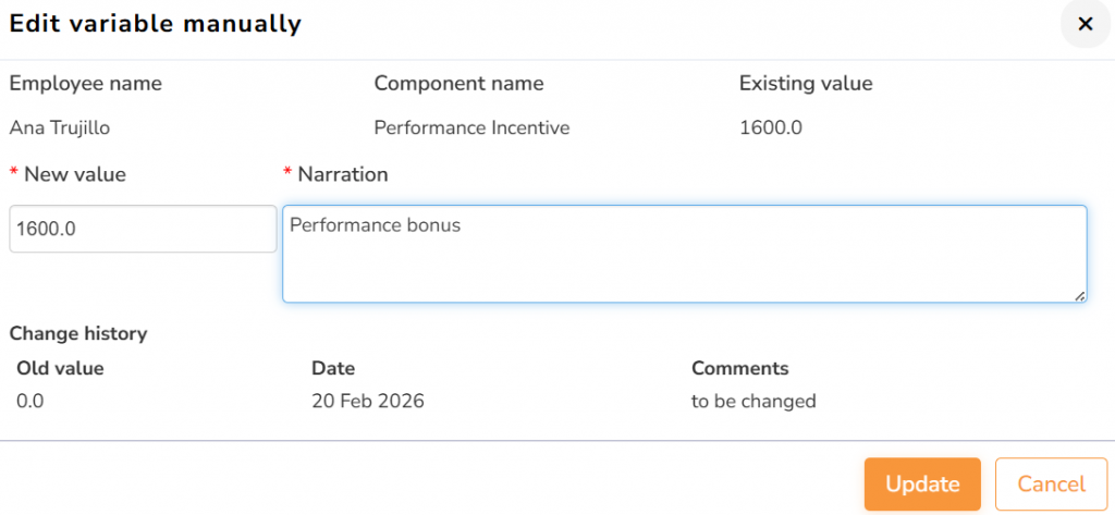 ● All the values for the payroll variables are clickable. You can click any value to manually modify it. Enter the new value in the New value field and add a reason in the Narration field.