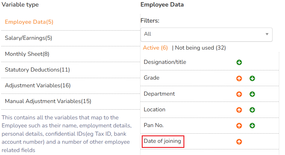 ● Now click Active to view the newly added variable (Date of joining) in the list of Active variables.