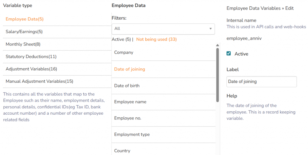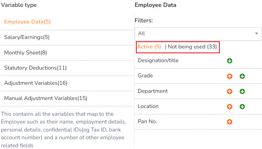 Each variable type list displays two types of variables, Active and Not being used, each indicating the number of variables they have. The Active variables are the selected variables for a variable type. These variables will be used while processing the payroll. The Not being used are the variables that are not used by the system in payroll processing. You can activate inactive variables if required.
