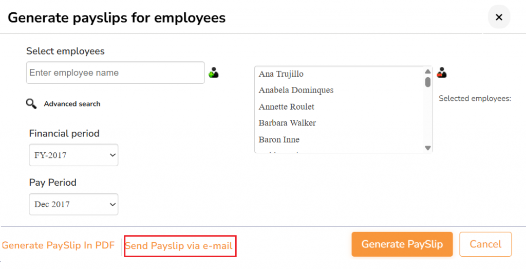 ● A new page appears Generate payslips for employees where you can generate payslips in browser and PDF format and share them with selected employees via e-mail. Click the relevant button to generate payslips in bthe rowser and PDF format.