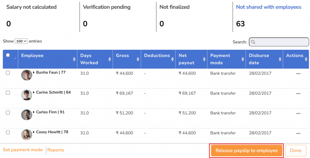 ● Select the employees and click on the Release payslip to employee link.