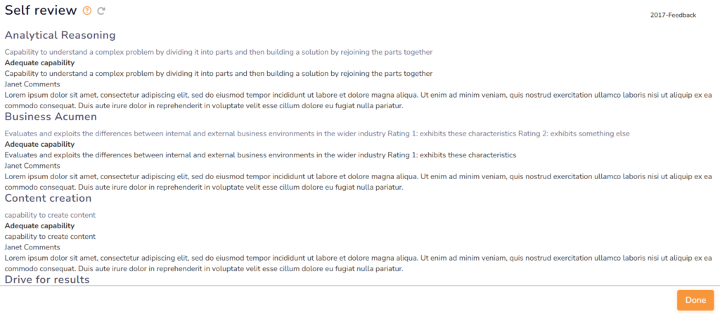 ● View: Click on this status link to view the summary report. The reports for self review and review by others appear in different formats.