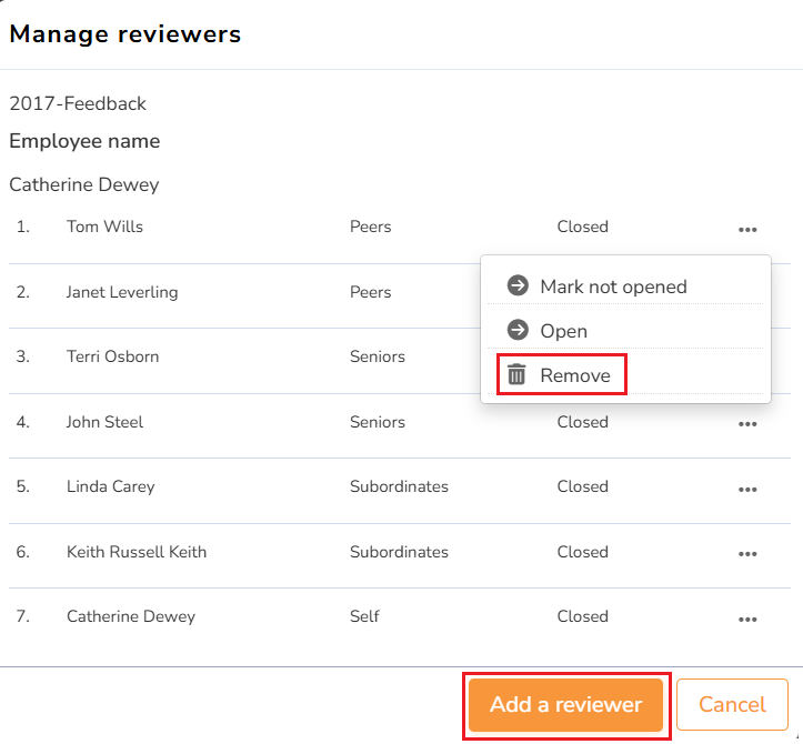 ● An HR Manager can manage appraisers for an employee. Click Manager reviewers. You can add a new appraiser or mark the existing one by clicking Add a reviewer or Remove, respectively.