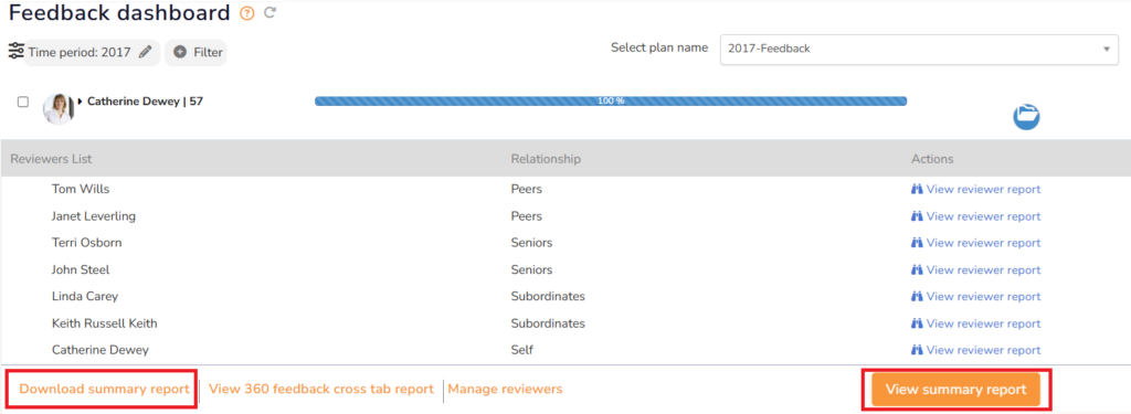 ● Click View summary report to view the consolidated report of the feedback. Appraisers can provide ratings against multiple competencies.