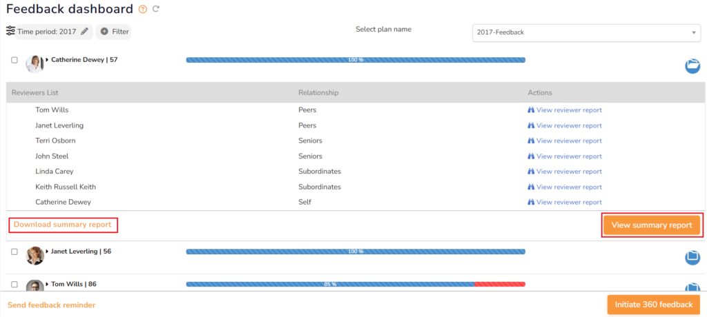 ● On the Dashboards page, click on the 360 Feedback tab. A new page Feedback dashboard, appears where you can view a list of reviewees along with the names of their appraisers.