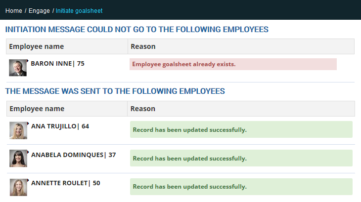 - Click the Initiate button. Figure 2 The Goalsheet message information page appears. The page displays the list of employees whose goalsheet are initialized or could not be initialized with their respective reasons.  Figure 3