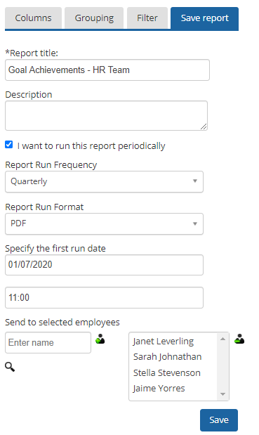4. Select I want to run this report periodically checkbox, if the report needs to be generated at periodical intervals. A new section appears where you can set Frequency, Date, Report format and Select Employees for whom the report will be generated.