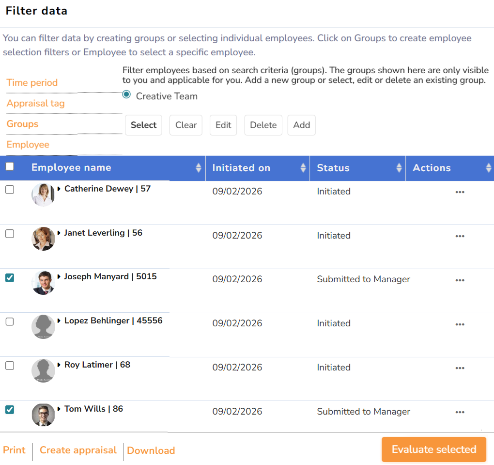 ● To evaluate multiple team members, select the team members whom you want to evaluate by clicking the checkbox corresponding to the employee names.
