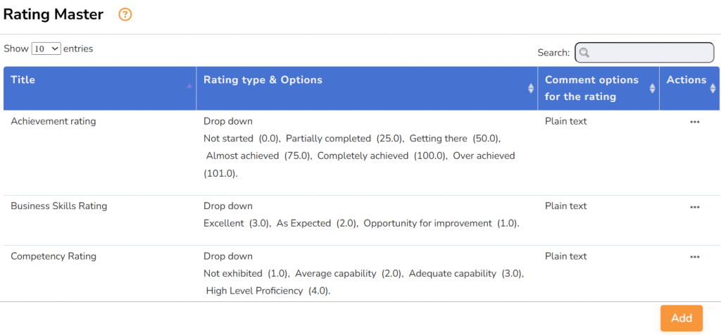 Empxtrack appraisal software offers a functionality to manage appraisal ratings. This feature allows addition and modification of ratings for different appraisal forms.