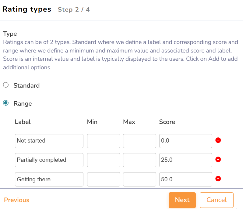 - Next, select the type of rating that you want to keep for the Type field. You can either select Standard rating format or choose to keep a Range for the rating.