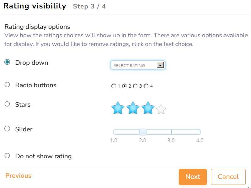 - Drop down: Select this option to display the rating scale as a dropdown on the page.